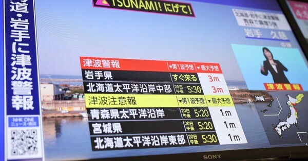 The Japanese climate company issued tsunami warnings for the Pacific coasts of Hokkaido, Aomori, and Iwate prefectures, forecasting tsunami waves of as much as 3 meters to reach instantly.