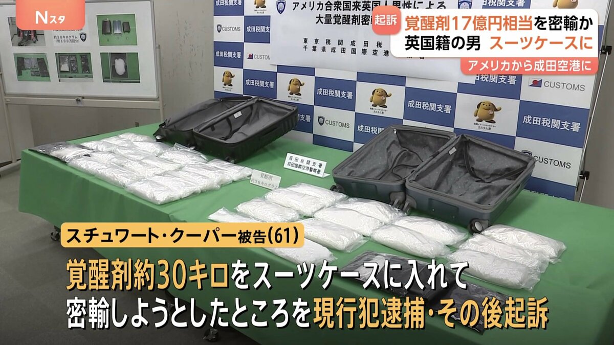 On October 6, British nationwide Stewart Cooper is alleged to have tried to smuggle roughly 30 kilograms of kakuseizai (methamphetamine) in suitcases carried on a flight from San Francisco that landed at Narita International Airport.