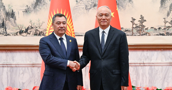 (250904) — BEIJING, Sept. 4, 2025 (Xinhua) — Cai Qi, a member of the Standing Committee of the Political Bureau of the Communist Party of China (CPC) Central Committee and a member of the Secretariat of the CPC Central Committee, meets with Kyrgyz President Sadyr Japarov in Beijing, capital of China, Sept. 3, 2025. Japarov was in China for the Shanghai Cooperation Organization Summit 2025, in addition to commemorations m