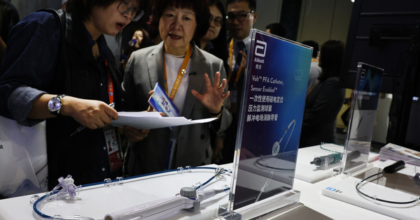 (251106) — SHANGHAI, Nov. 6, 2025 (Xinhua) — Visitors view a Volt PFA catheter of Abbott Laboratories, which made its debut in Asia, throughout the eighth China International Import Expo (CIIE) in east China’s Shanghai, Nov. 6, 2025. Many exhibitors showcased their newest merchandise for the primary time on the eighth CIIE in Shanghai. (Xinhua/Fang Zhe)