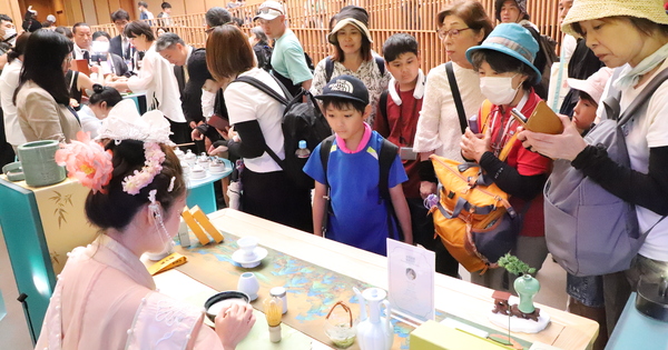 (250712) — OSAKA, July 12, 2025 (Xinhua) — People watch a tea artwork show on the “Zhejiang Week” of China Pavilion on the Expo 2025 Osaka in Osaka, Japan, on July 12, 2025. The “Zhejiang Week” of China Pavilion on the Expo 2025 Osaka kicked off on Saturday. (Xinhua/Li Ziyue)