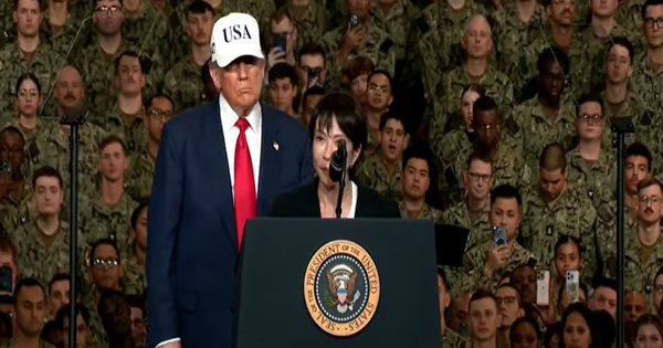 Acknowledging her historic ascent as Japan’s first feminine prime minister, Trump remarked, ‘I’ve to say this, the primary feminine prime minister,’ drawing cheers from the assembled servicemen.