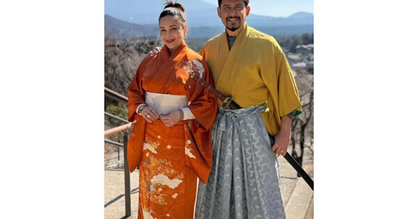 Another photograph reveals Madhuri wearing a printed saffron kimono with a cream sash. The couple additionally shared a selfie taken in entrance of a Japanese temple.