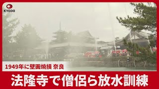 A water-spraying firefighting drill was held on the World Heritage-listed Horyuji Temple in Ikaruga, Nara Prefecture, on January twenty sixth, Cultural Property Fire Prevention Day, with monks and native volunteer firefighters collaborating.