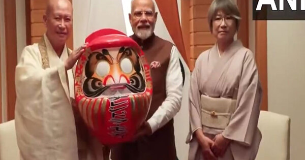Tokyo [Japan], August 29 (ANI): Prime Minister Narendra Modi was introduced with a Daruma doll, a standard Japanese doll symbolising good luck, by the Chief Priest of Shorinzan Daruma-Ji Temple in Tokyo.