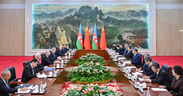 (250831) — TIANJIN, Aug. 31, 2025 (Xinhua) — Chinese President Xi Jinping meets with Azerbaijani President Ilham Aliyev in Tianjin, north China, Aug. 31, 2025. Aliyev is in China to attend the Shanghai Cooperation Organization (SCO) Summit 2025, in addition to commemorations marking the eightieth anniversary of the victory within the Chinese People’s War of Resistance towards Japanese Aggression and the World Anti-Fascist War. (Xinhua/Yue Yuewei)