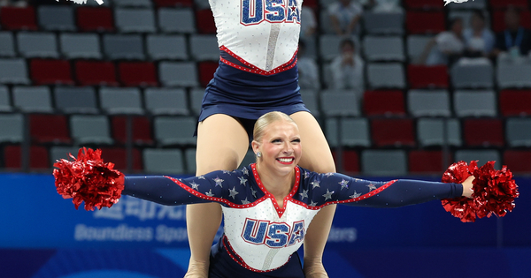 (250815) — CHENGDU, Aug. 15, 2025 (Xinhua) — Allison Hoeft/Sydney Martin of the United States carry out throughout the Cheerleading Pom Doubles Semifinals Round 1 at The World Games 2025 in Chengdu, southwest China’s Sichuan Province, Aug. 15, 2025. (Xinhua/Liang Xu)