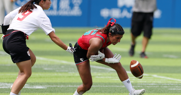 (250814) — CHENGDU, Aug. 14, 2025 (Xinhua) — Zara Galan (R) of Mexico competes in the course of the Flag Football Women’s Preliminary Round Group B Game between Mexico and Japan at The World Games 2025 in Chengdu, southwest China’s Sichuan Province, Aug. 14, 2025. (Xinhua/Chen Bin)