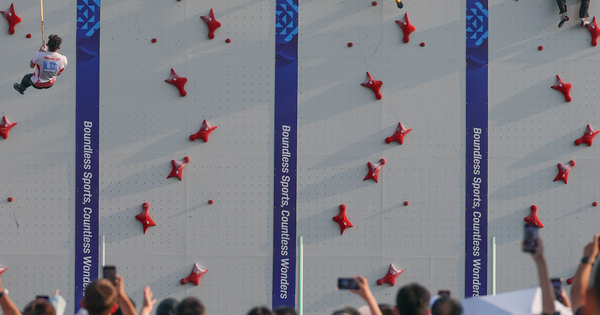 (250815) — CHENGDU, Aug. 15, 2025 (Xinhua) — Veddriq Leonardo of Indonesia, Long Jianguo of China, Yang Jie of China and Logan James Schlecht of the United States (L to R) compete in the course of the Sport Climbing Men’s Speed Single 4 quarterfinal at The World Games 2025 in Chengdu, southwest China’s Sichuan Province, Aug. 15, 2025. (Xinhua/Chen Cheng)