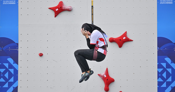 (250815) — CHENGDU, Aug. 15, 2025 (Xinhua) — Amanda Narda Mutia of Indonesia reacts after falling through the Sport Climbing Women’s Speed Single 4 Qualification Round at The World Games 2025 in Chengdu, southwest China’s Sichuan Province, Aug. 15, 2025. (Xinhua/Chen Cheng)