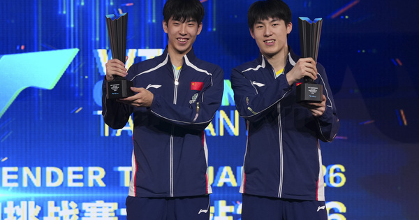 (260412) — TAIYUAN, April 12, 2026 (Xinhua) — First-placed Li Hechen (L)/Wen Ruibo of China pose for images in the course of the awarding ceremony for the lads’s doubles on the World Table Tennis (WTT) Contender Taiyuan 2026 in Taiyuan, north China’s Shanxi Province, April 12, 2026. (Xinhua/Yang Chenguang)