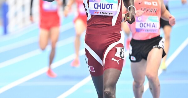 (260208) — TIANJIN, Feb. 8, 2026 (Xinhua) — Chuot Ibrahim Abass M of Qatar celebrates after the lads’s 800m ultimate on the twelfth Asian Indoor Athletics Championships 2026 in Tianjin, north China, Feb. 8, 2026. (Xinhua/Li Ran)