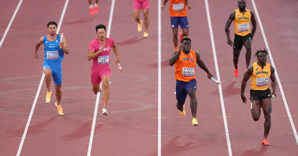 (250921) — TOKYO, Sept. 21, 2025 (Xinhua) — Abdul-Rasheed Saminu of staff Ghana, Elvis Afrifa of staff the Netherlands, Xie Zhenye of staff China and Matteo Melluzzo of staff Italy (entrance from R to L) compete throughout the males’s 4x100m relay heats on the 2025 World Athletics Championships in Tokyo, Japan, Sept. 20, 2025. (Xinhua/Ju Huanzong)