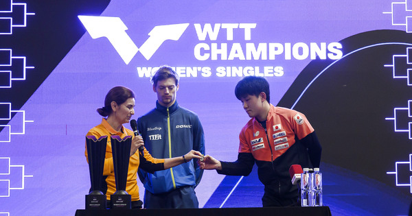 (260106) — DOHA, Jan. 6, 2026 (Xinhua) — Anders Lind (C) of Denmark and Tomokazu Harimoto (R) of Japan attend the ladies’s singles draw ceremony of the WTT Champions Doha 2026 in Doha, Qatar, on Jan. 5, 2026. (Photo by Nikku/Xinhua)