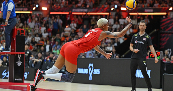 (250906) — BANGKOK, Sept. 6, 2025 (Xinhua) — Melissa Teresa Vargas of Trkiye tries to avoid wasting the ball in the course of the semifinal match between Japan and Trkiye on the Volleyball Women’s World Championship in Bangkok, Thailand, Sept. 6, 2025. (Xinhua/Hou Zhaokang)
