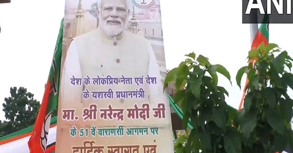 The visuals present hoardings welcoming PM Modi for his 51st go to to his Lok Sabha constituency.